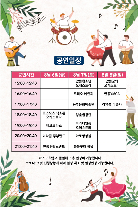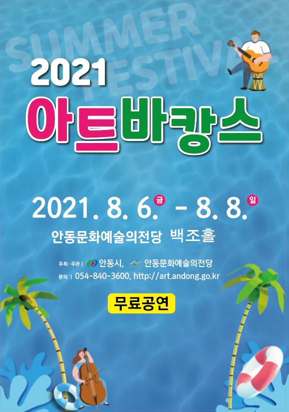 [안동타임뉴스=남재선 기자]안동문화예술의전당은 오는 6일(금) 오후 6시부터 8일 오후 6시까지 지역 예술인들로 구성한 아트바캉스를 개최한다. 이번 아트바캉스는 당초 전당 야외 공연장에서 진행될 예정이었으나 코로나 19 확산 방지를 위한 야외 공연금지 조치가 8월 8일까지 연장되고 있어 정규 공연장인 실내 백조홀에서 진행한다.