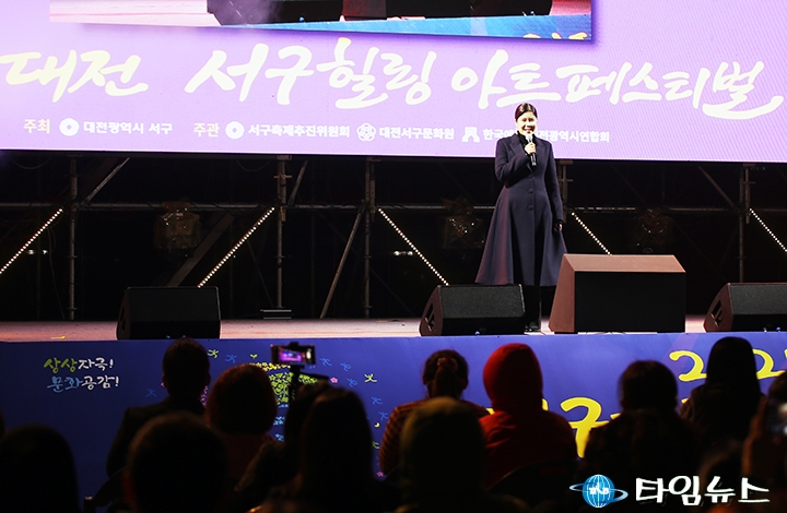 [대전타임뉴스=홍대인 기자] ‘2021 대전 서구힐링 아트페스티벌’이 서구청 앞 보라매공원에서 19일 개막한 가운데 가수 ‘린’이 축하 공연을 하고 있다. 올해로 다섯 번째를 맞는 서구힐링 아트페스티벌은 ‘상상자극! 문화공감!’을 주제로, 도심 속 공원에서 지역의 문화예술 인프라를 활용해 지역민과 예술가가 함께하는 참여형 예술축제다. 보라매공원에 조성한 ‘아트빛터널’은 서구의 가을과 겨울을 주제로 하여 음악과 풍경이 함께하는 460m 구간의 테마별 빛터널로 다음 달 26일까지 운영되며, 형형색색의 LED 조명으로 연출하는 환상적인 빛의 향연이 관람객들에게 즐거운 추억을 선사하고 있다. 축제의 대표프로그램인 아트마켓은 60개의 부스에서 예술작가들이 관람객과 소통하며 회화와 공예 등 수준 높은 작품을 전시·판매한다. 또한 트릭아트, 미술심리치료, 버블아트, 샌드아트 등 온 가족이 함께 즐길 수 있는 다양한 체험프로그램이 관람객을 맞이하고 있다.
