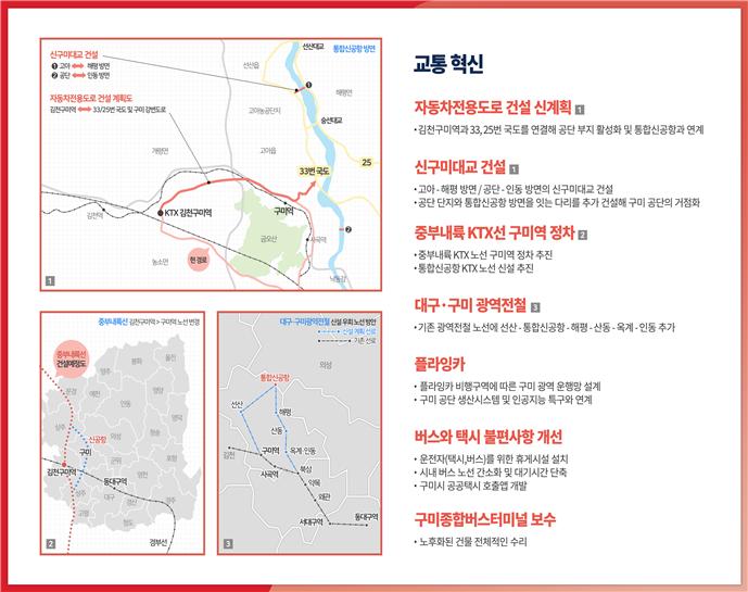 또한 김 예비후보는 “구미-대구권 광역전철을 통해 (사곡역~구미역~선산~통합신공항~해평~산동~옥계·인동~북삼 경유) 구미 관내 사통팔달 교통망을 추진하겠다"고 밝혔다.
