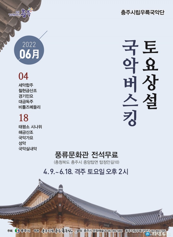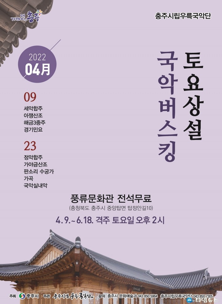 [충주타임뉴스=한정순 기자] 충주시립우륵국악단(단장 김두환)은 오는 4월 9일부터 6월 18일까지 격주로 토요일 오후 2시에 풍류문화관에서 토요상설공연 ‘국악 버스킹’으로 관객들을 맞이한다. 공연은 총 6회로 ‘4월 9일, 23일, 5월 7일, 21일, 6월 4일, 18일’에 진행될 예정이며, 전석 무료로 관람이 가능하다. 국악단은 중앙탑공원 내 풍류문화관(충주시 중앙탑면 탑정안길 10)에 상설무대를 마련해 탄금호의 아름다운 자연을 배경으로 선조들의 풍류의 멋을 되새겨 볼 수 있는 충주시의 명소도 소개한다. 이번 공연은 바쁜 일상 속에서 평소 공연을 즐길 시간이 부족한 시민들에게 국악을 깊이 즐길 수 있도록 함으로써 국악의 대중화와 활성화를 도모하기 위해 마련됐으며, 봄 날씨에 온 가족이 함께 즐길 수 있게 흥미있는 프로그램으로 준비했으며 또한, 전통의 멋과 흥을 섬세하고 실감나게 전달하기 위해 궁중음악과 민속음악뿐만 아니라 창작 음악과 서양 가곡 등 크로스오버된 국악 무대로 시민과 관광객들에게 즐거움을 선사할 예정이다. 한편, 공연은 코로나19 확산 방지를 위해 방역 규정을 철저히 준수해 운영된다. 김두환 부시장은 “관광객과 시민분들께서는 사랑하는 가족, 연인, 친구와 함께 다채로운 즐거움이 있는 충주시립우륵국악단 상설 공연장에 찾아오셔서 아름다운 풍경과 함께 즐거움을 만끽하시길 바란다"고 했다. 국악 버스킹 관련 자세한 사항은 충주시립우륵국악단(☏043-850-7305) 및 충주시 문화예술과(☏043-850-5964)로 문의하면 된다.