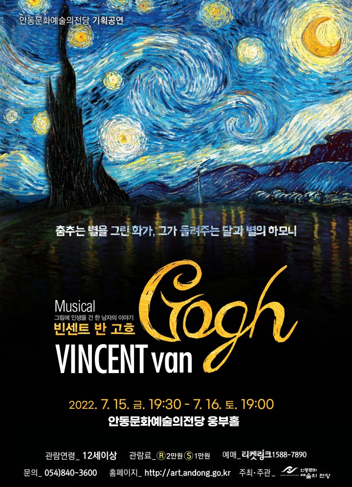 이번 공연은 자신의 삶을 바쳐 절묘한 색채, 열정적인 붓놀림, 독특한 윤곽 형태 등으로 현대미술사의 표현주의 흐름에 강한 영향력을 미친 인상파 화가 빈센트 반 고흐와 그를 묵묵히 뒤에서 지원한 동생 테오 반 고흐의 이야기를 표현한 창작 뮤지컬이다. ‘빈센트 반 고흐’와 동생 ‘테오 반 고흐’가 주고받은 700여 통의 편지와 빈센트 반 고흐가 남긴 아름다운 명작을 소재로 그의 짧지만 강렬한 삶의 여정을 호소력 있는 뮤지컬 배우 박민성과 윤은오의 개성있는 연기로 만날 수 있다. 또한 한국 인디음악 기둥 같은 싱어송라이터 선우정아가 작곡한 마음을 울리는 서정적인 음악과 함께 3D 프로젝션 맵핑 영상기술을 통해‘별이 빛나는 밤에’,‘해바라기’,‘꽃 피는 아몬드 나무’등 고흐의 명작을 무대 위에 생생하게 되살려 표현한다. 뮤지컬‘빈센트 반 고흐’의 관람료는 R석 2만원, S석 1만원으로 12세 이상 관람이 가능하다. 자세한 사항은 전화(☎054-840-3600)로 문의하거나 안동문화예술의전당 홈페이지(http://www.andong.go.kr/arts)에서 확인할 수 있다.