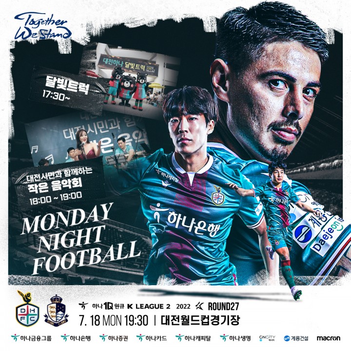 [대전타임뉴스=홍대인 기자] 대전하나시티즌이 오는 7월 18일 오후 7시 30분 대전월드컵경기장에서 서울이랜드와 홈경기를 갖는다. 대전은 지난 25라운드 안산그리너스와의 홈경기에서 2:0 승리를 거두며 홈 20경기 연속 무패(13승 7무) 구단 신기록을 달성했다. 지난해 7월부터 안방에서 패하지 않고 있는 대전은 이랜드와의 맞대결에서도 홈 절대 강자의 면모를 이어가겠다는 각오다. 이날 경기에는 특별한 손님이 대전월드컵경기장을 찾는다. 2002년 한일 월드컵 20주년을 맞아 한국축구 레전드 골키퍼인 김병지가 경기장을 찾는다. 김병지는 K리그 통산 706경기에 출장했으며 대한민국 축구 국가대표팀에서도 61경기 출전기록을 보유하고 있는 레전드 선수이다. 경기 전과 하프타임 ‘김병지와 함께하는 치맥타임’, ‘김병지와 함께하는 PK 대결 이벤트’ 등을 통해 팬들과 직접 소통하는 시간을 갖는다. 이벤트는 사전 신청을 통해 참가자를 모집하며 자세한 내용은 대전하나시티즌 공식 홈페이지 및 공식 SNS를 통해 확인할 수 있다. 또한 경기 전, 대전월드컵경기장 남문 광장에서는 ‘대전시민과 함께하는 한여름의 작은 음악회’가 열린다. 음악회는 경기 시작 한 시간 반 전인 18시부터 19시까지 진행되며 다양한 앙상블 공연과 즐거운 해설을 통해 남녀노소가 함께 즐길 수 있도록 구성된다. 푸드트럭과 플리마켓을 통해 다양한 먹거리도 제공되며 관람객들의 편안한 이용을 위해 조명과 테이블, 벤치가 남문광장에 설치된다. 대전하나시티즌 홈경기 티켓은 대전하나시티즌 공식 홈페이지를 통해 예매할 수 있으며 홈경기일(7월 18일) 경기 시작 두 시간 전(17:30~)부터 대전월드컵경기장 내 매표소에서도 구매할 수 있다.