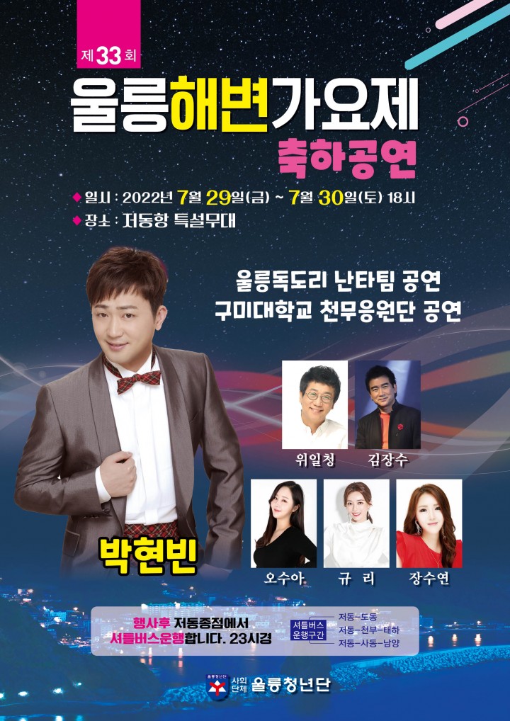 올해 33번째를 맞이한 이번 가요제는 신종코로나바이러스 감염증(코로나19)으로 인한 사회적거리두기가 2년여만에 해제되면서, 다시 시작되는 행사다. 일상회복이 이루어지는 가운데 이번 행사를 두고 울릉도를 찾는 관광객들과 지역주민들은 울릉도에 새로운 변화의 바람이 부는 것 같다며 기대가 크다. 촛대바위가 보이는 동해안 어업전진기지 저동항에서 스트레스도 날리고 즐거운 음악의 밤을 보내면서 야시장에서 풍성한 먹거리도 맛볼 수 있다. 가요제 1일차 예선 식전행사로 독도리난타팀의 축하공연을 시작으로, 초청가수 오수아, 규리, 김장수가 출연하고, 2일차 본선에 초청가수 장수연, 위일청, 박현빈이 출연하며 경품추첨과 불꽃놀이 등 즐겁고 흥겨운 시간을 보낼 수 있다. 밤바다의 낭만과 즐거움을 함께하는 이번 울릉해변가요제 주최 울릉청년단(사회봉사단체 회원33명)은 매회 축제행사 수익금을 울릉군 차상위계층 학생들에게 장학금으로 전달해 오고 있다며, 울릉도를 찾는 여행객들을 위한 만반의 준비를 하고 있으니 많이 찾아와 행복한 여름밤의 추억을 남기기를 바란다고 말했다.