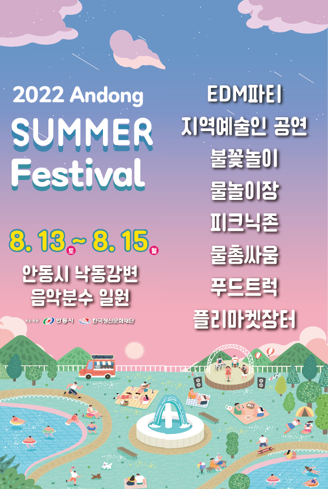 [안동타임뉴스=남재선 기자]안동시가 주최하고 한국정신문화재단(이사장 이희범)이 주관하는 『2022 안동 썸머 페스티벌』이 오는 8월 13일부터 15일까지 사흘간 낙동강변 음악분수 일원에서 개최된다.