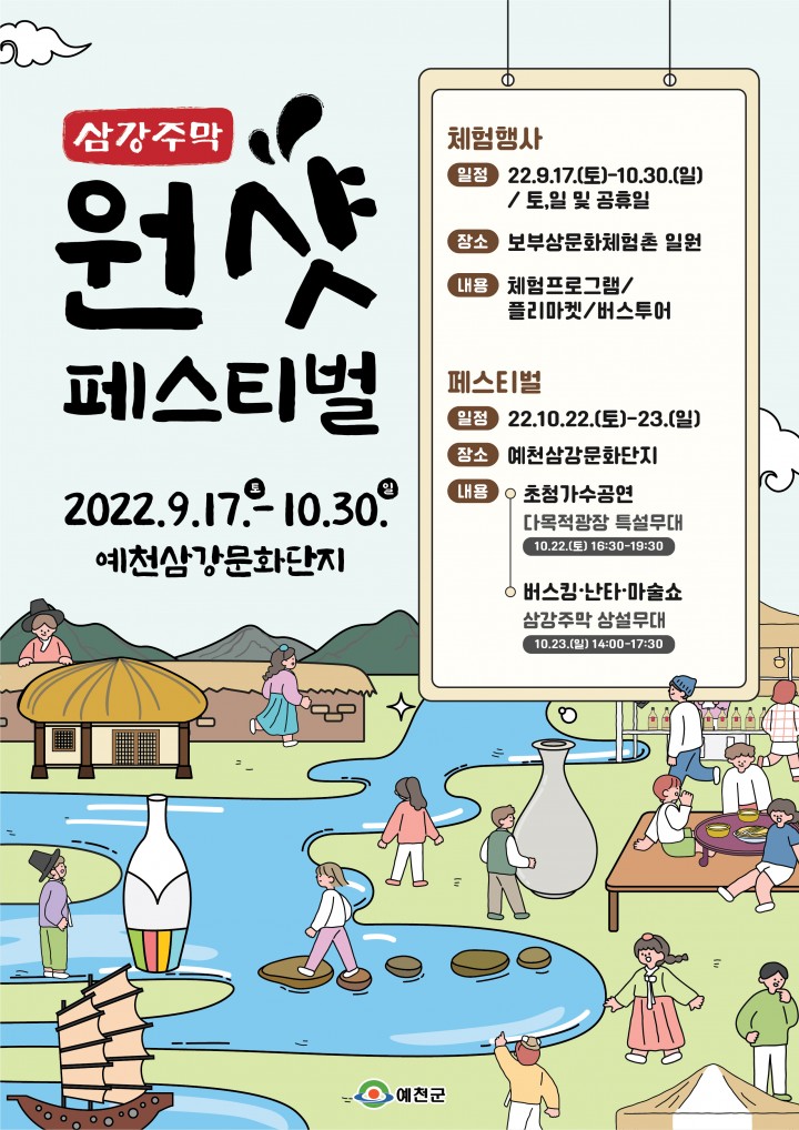[예천타임뉴스=남재선 기자]예천군이 주최․주관하는 ‘삼강주막 원샷 페스티벌’이 9월 17일부터 10월 30일까지 주말과 공휴일 총 16일 동안 풍양면 삼강문화단지 내 보부상체험촌에서 개최된다.