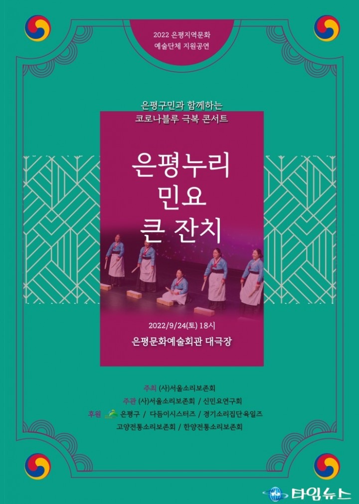 [서울타임뉴스 = 김호심 기자](사)서울소리보존회(이사장 남혜숙 명창)는 오는 24일 (토) 오후 6시 은평문화예술회관 대극장에서 은평구민과 함께하는 코로나 블루 극복 콘서트 ‘은평 누리 민요 큰 잔치’를 개최한다. 은평구 2022 지역 문화예술단체 지원사업의 일환으로 열리는 이 공연은 코로나19로 피로도가 높은 구민들의 스트레스를 해소하고 은평 지역 대면 공연 활성화에 기여할 목적으로 기획되었다. 이번 공연에는 남혜숙 이사장을 비롯 경기민요 이수자로 전주대사습놀이 민요부 장원을 차지한 이승은 명창, 평양검무 이수자 최정희 명무, 송서율창 이수자 유근순 명창, 향제시조 이수자 홍순옥 명창 등 서울소리보존회의 중견명창, 그리고 서울소리보존회의 대표적인 예술팀 다듬이시스터즈(단장 최영자), 서도 재담 소리예술단, 경기소리 집단 육일즈 등이 출연한다.