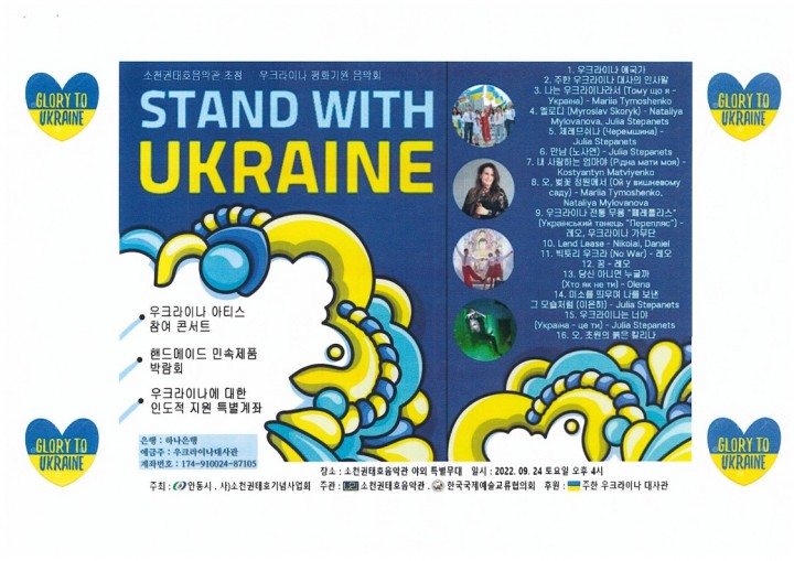 이번 공연에서는 클래식 악기를 비롯해 양국가들의 노래와 전통음악을 선보이며 가수 및 댄서의 다양한 퍼포먼스 공연으로 채워진다. 함께 진행되는 핸드메이드 민속제품 박람회는 색다른 볼거리를 제공한다.소천권태호음악관은 매년 국내외 수준 높은 음악가들을 초청해 기획공연을 개최하고 있으며, 올해도 지난 1월부터 매달 진행 중이다.9월 24일에 개최되는 이번 공연은 재한 우크라이나인들이 참여하는 평화기원 음악회로 전쟁의 고통에서 신음하는 우크라이나인들의 아픔을 공감하면서 평화를 한마음 한뜻으로 기원하는 콘서트이다.공연 관람료는 전석초대(무료)이며 자세한 내용은 소천권태호음악관 누리집(http://www.socheonmusic.kr)과 전화(☏821-7779)를 통해 확인 및 문의가 가능하다.