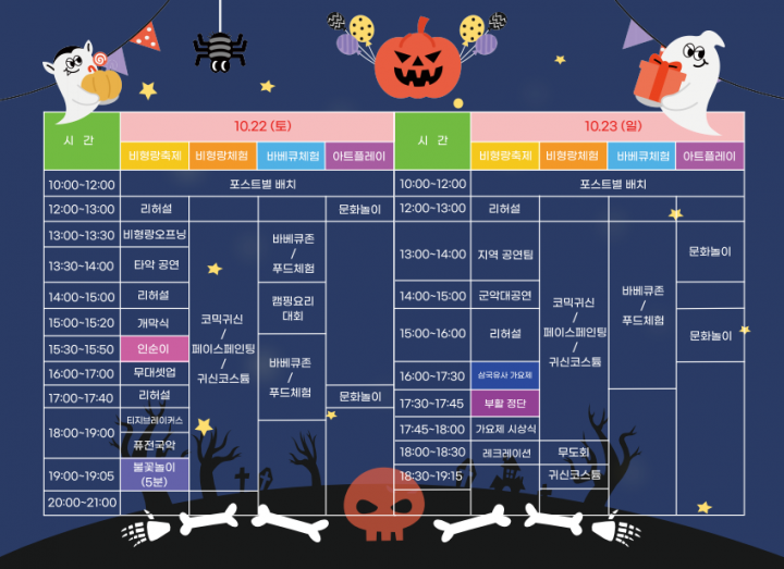 [군위타임뉴스=박성준 기자] 10월 22일, 23일 ‘비형랑 축제’와 ‘바베큐 축제’를 통합하여 ‘고스트&바베큐 축제’를 진행한다.