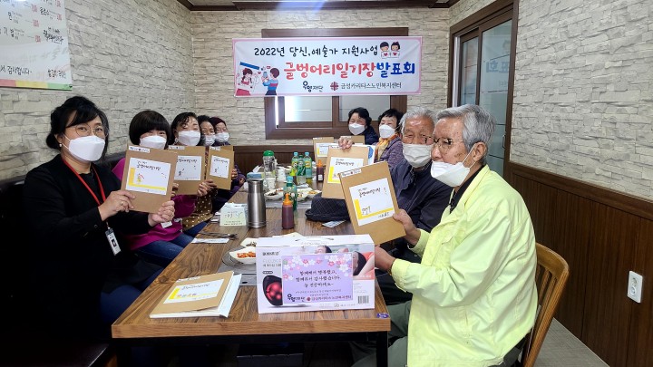 금성카리타스 노인복지센터는 우양재단 후원‘당신, 예술가 지원사업’에 선정되어, 2022년 7월부터 10월까지 10여 명의 어르신을 대상으로 글벙어리 일기장을 작성하는 사업을 진행했다. 마인드맵을 이용한 자기소개, 꿈과 관련한 시 짓기, 자화상정물화 그리기, 자녀에게 편지 쓰기 등으로 구성된 글벙어리 일기장은 어르신들이 평소 표현하지 못했던 꿈과 애환, 추억들이 담겨 자신의 삶에 자긍심을 갖게 하는 긍정적인 효과를 보였다.