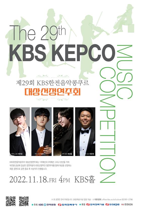 올해 제29회 KBS한전음악콩쿠르는 피아노, 현악, 관악, 성악 총 4개 부문의 참가자들이 지난 6월과 7월 예선과 본선을 거쳐 부문별 총 12명의 금‧은‧동상 입상자를 선정했다. 각 부문 금상을 받은 연주자들은 18일 KBS교향악단과의 협연으로 펼쳐지는 최종 경연인 대상선정연주회를 통해 대상 수상자를 선정하게 된다.