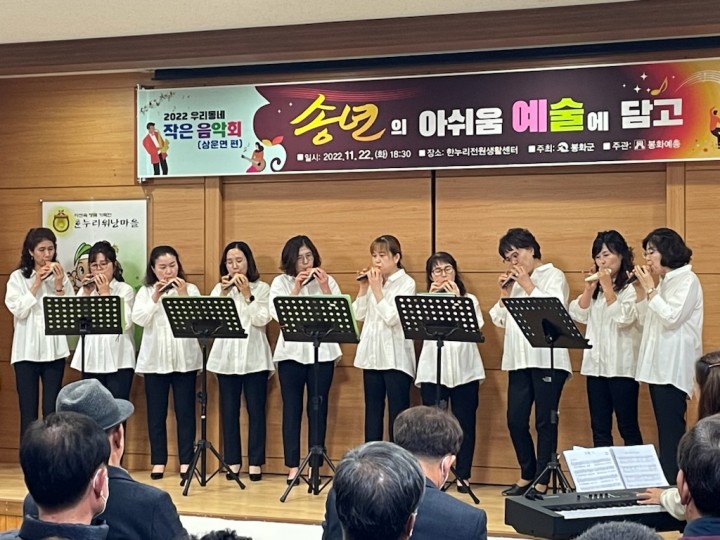 [봉화타임뉴스=남재선 기자]올해 세 번째 ‘우리 동네 작은 음악회’가 지난 22일 상운면 한누리 전원생활 센터에서 ‘송년의 아쉬움 예술에 담고’라는 주제로 개최됐다. (사)한국예총 봉화지회가 주관한 우리 동네 작은 음악회는 한국국악협회 봉화지부의 사물놀이를 시작으로 BS합주단, 오카리나 합주, 댄스, 민요, 가수 정준, 단고은의 공연 등 다채로운 프로그램이 진행돼 보는 이들의 감성을 충전하고 송년의 아쉬운 마음을 보듬어 줬다.