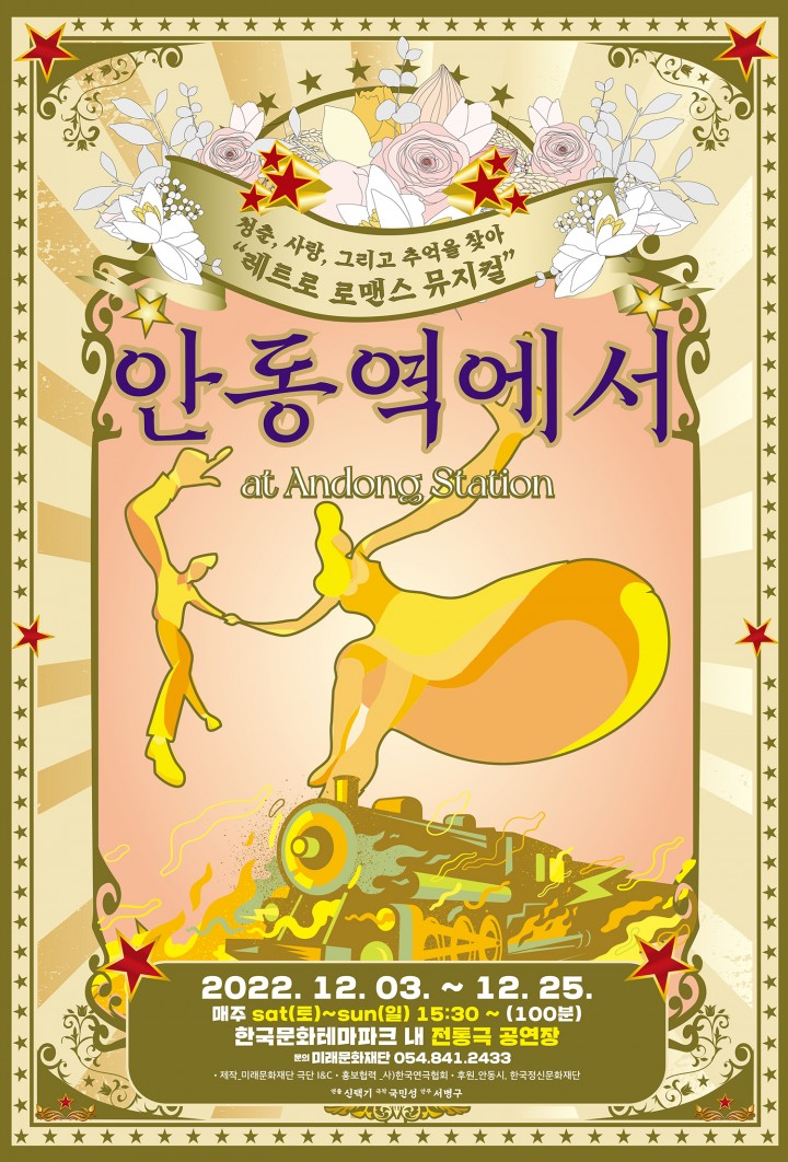 안동시와 한국정신문화재단이 추진하고 미래문화재단 극단 I&C가 제작을 맡은 스테이션 로맨스 음악극 ‘안동역에서’는 한국문화테마파크 전통극 극장에서 12월 25일까지 매주 토요일과 일요일 오후 3시 30분부터 100분간 진행된다.