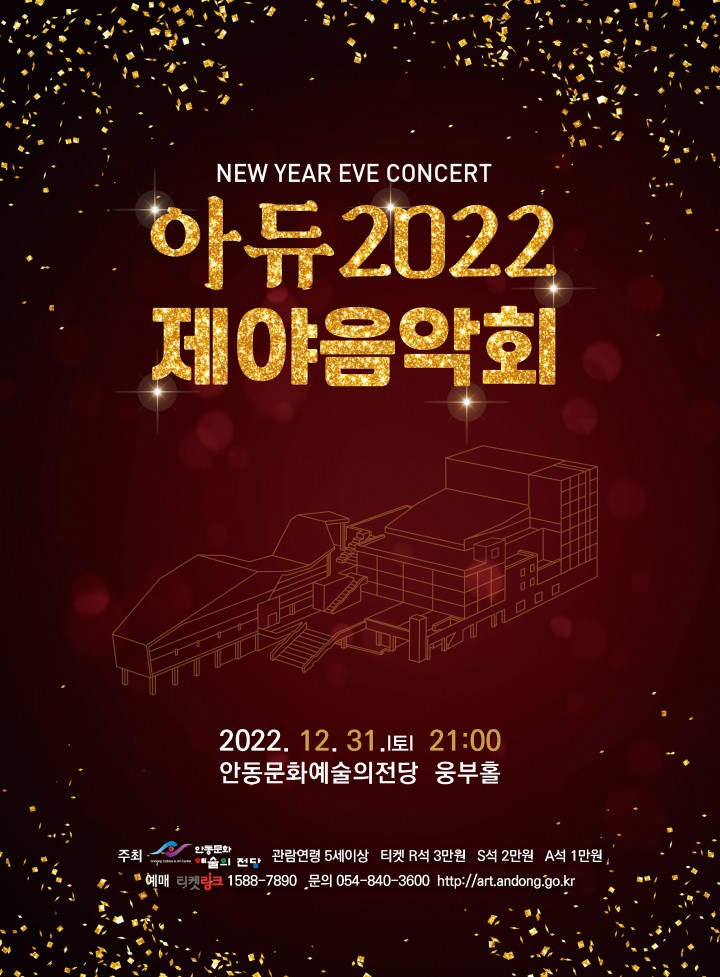 이번 공연에는 정통 클래식의 재해석과 창의적인 노력을 더해 클래식의 대중화를 지향하는 지휘자 방성호가 이끌고 있는 한강심포니오케스트라와 함께 클래식에서부터 가요, 트로트, 국악 등 다양한 장르의 음악을 준비했다. 1부는 안동시 문화사절단으로 역량을 펼치고 있는 안동시립합창단, 소프라노 유성녀, 안정적이고 섬세한 연주로 국내외에서 왕성한 활동을 하는 테너 문세훈, 2022 안동문화예술의전당 클래식 영 아티스트 콘서트에 바이올린 협연한 안동부설초등학교 조하영이 품격있는 클래식 음악으로 오픈한다. 2부는 가창력 끝판왕 가수 박기영, 트롯 야생마 국악 가수 신승태, 색소포니스트 김성훈과 안동 지역 출신으로 뮤지컬 분야의 다양한 활동을 하고 있는 뮤지컬 가수 이승욱, 안동부설초등학교 재학 중으로 미스터트롯2 참가 및 KBS1TV 아침마당 출연으로 활동하는 트로트 가수 권도훈이 출연하여 관람객들에게 볼거리 있는 즐거움을 선사할 것으로 기대한다. 안동문화예술의전당‘아듀! 2022 제야음악회’는 R석 3만원, S석 2만원, A석 1만원으로 5세이상 관람이 가능하며, 공연의 자세한 사항은 전화(☎054-840-3600)로 문의하거나 안동문화예술의전당 홈페이지(http://www.andong.go.kr/arts)에서 확인할 수 있다.