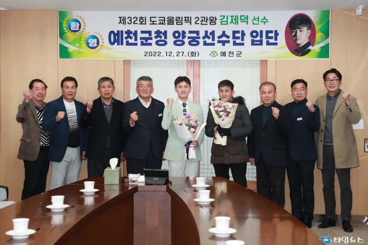 김제덕 선수는 27일 오후 4시 30분 김학동 군수, 최병욱 군의장, 변형우 경북양궁협회장, 이철우 예천군체육회장, 문형철 감독이 참석한 가운데 군수실에서 입단 신고를 했다. 지난해 도쿄올림픽에서 남자단체전과 혼성단체전에서 2관왕과 양크턴 세계양궁선수권에서 남자단체전 금메달을 목에 건 명실상부 세계 최고 남자 궁사이며 도쿄올림픽 당시 17세 3개월로 한국 남자 양궁 역대 최연소 올림픽 금메달 획득이라는 새로운 역사를 쓰기도 했다. 특히, 초등학교 시절부터 일찌감치 양궁 신동으로 주목받으며 SBS‘영재발굴단’에 출연하는 등 천부적인 감각과 남다른 승부 근성, 흔들림 없는 멘탈까지 갖춘 대형 유망주로 기대를 모으고 있는 선수다. 예천군청 양궁선수단은 1983년 4월 창단해 남자팀과 여자팀으로 구성돼 있으며 그동안 호진수, 김미자, 양승현, 김성남, 한희정, 최미진, 장용호, 김수녕, 최남옥, 최원종, 윤옥희 선수 등 수많은 국가대표를 배출한 명문 팀으로 호평받고 있다. 김제덕 선수는 “학교 양궁부의 적극적인 지원과 군민들의 많은 성원에 감사드리고 내년도 항저우 아시안게임에서도 좋은 성적을 거둘 수 있도록 최선을 다하겠다."고 말했다. 김학동 군수는 “김제덕 선수의 입단을 진심으로 환영하고 항저우 아시안게임에서도 좋은 성적을 거둬 예천은 물론 한국 양궁의 기둥이 되길 바란다."며 “앞으로도 김제덕 선수가 대형선수로 성장할 수 있도록 모든 지원을 아끼지 않겠다."고 말했다. 한편, 예천군청 소속 김제덕 선수와 장지호 선수는 ‘2023년도 국가대표 선발’ 20명에 포함됐으며 2023년 9월 23일부터 10월 8일까지 개최되는 항저우 아시안게임 양궁 국가대표로 최종 선발될지 귀추가 주목된다.
