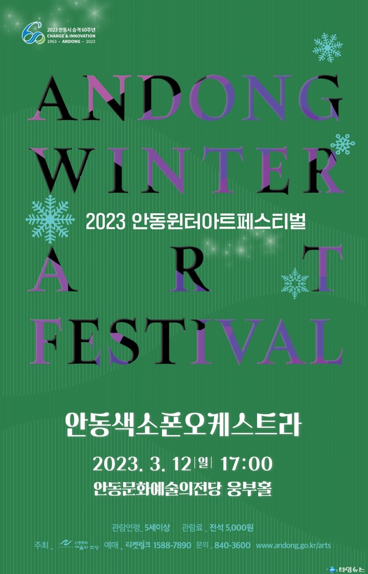 코스모스색소폰오케스트라는 안동시에 거주하는 직장인으로 구성된 예술 단체로 지역 사회에 색소폰 음악을 통해 행복을 전하고자 다양한 봉사 활동과 음악 공연으로 이바지하고 있다. 큰 음량과 아름답고도 부드러운 음색을 지닌 목관악기 색소폰으로 클래식, 대중가요, 올드 팝송 등 색소폰 솔로, 듀엣, 앙상블, 오케스트라 합주 등 다양한 프로그램을 구성해 관람객들에게 색다른 볼거리를 제공할 예정이다. 2023년 안동윈터아트페스티벌‘코스모스색소폰오케스트라 봄맞이 색소폰의 향연’의 관람료는 전석 5,000원으로 5세 이상 관람이 가능하다. 자세한 사항은 전화(☎054-840-3600)로 문의하거나 안동문화예술의전당 홈페이지(http://www.andong.go.kr/arts)에서 확인할 수 있다.