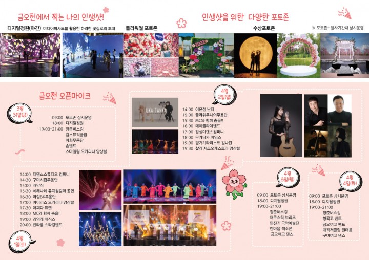 그동안 거리예술공연 위주로 진행되던 축제의 성격에 변화를 주어 올해부터 개최시기를 봄으로 앞당겼으며, 더 많은 시민들과 함께 누리기 위해 포토존, 버스킹존, 체험존, 이벤트존 등 구역별로 다양한 프로그램을 구성했고, 푸드존도 운영한다. 올해는 금오천의 아름다운 벚꽃과 함께“내 인생 최고의 인생샷 남기기"주제로 금오천 산책길에 4가지 테마의 플라워월(꽃벽), 하천 위 수상 포토존 및 미디어파사드 조성으로 밤낮으로 예쁜 축제 공간을 마련했으며 5일간의 축제 기간동안 버스킹 노래 선율이 끊임없이 흘러나올 예정이다. 또한, 주말에는 개막식 및 축하공연을 시작으로 푸드존과 다양한 핸드메이드 수공예품을 만날 수 있는 아트마켓과 풍선아트, 캐리커쳐, 도어벨 만들기 등 직접 참여하는 재미가 있는 아트체험부스 운영 및 거리의 노래방, 컬링, 다트, 룰렛, 자석낚시게임 등 다채로운 이벤트 프로그램들이 타임 어택형으로 진행되며, 시민들이 자유롭게 연주할 수 있는 거리의 피아노도 상시 설치한다. 사업주관단체는“천혜의 자연환경이자 구미의 자랑인 금오산 밑자락 금오천에서 시민들과 함께할 수 있어 기쁘고, 해를 거듭할수록 더욱 재밌고 다채로운 내용과 볼거리, 즐길거리가 가득한 금오천이 되어 시민들의 발걸음이 계속 이어질 수 있도록 금오천의 특성을 잘 살린 구미만의 축제로 성장해 나가겠다."라고 전했으며, 김장호 구미시장은“구미시 대표 벚꽃축제로서 자리매김하고, 해마다 봄이 되면 금오천이 떠오를 수 있도록 많은 변화를 주었으니, 흐드러지게 핀 벚꽃이 수놓은 금오천에서 가족·친구·연인 누구나 아름답고 즐거운 추억과 예쁜 사진 많이 남기시길 바라며 이처럼, 일상에서 시민들이 문화와 예술이 흘러넘치는 낭만문화도시 구미를 체감할 수 있는 다양한 문화정책으로 꾸준히 시민들에게 다가가겠다."라고 밝혔다.