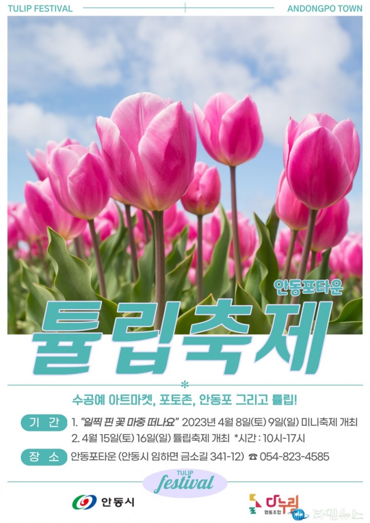 [안동타임뉴스=남재선 기자]‘안동포타운 튤립 축제’가 다누림협동조합 주관으로 4월 8일부터 16일까지 기간 중 토, 일요일마다(10시 ~ 17시) 개최된다.