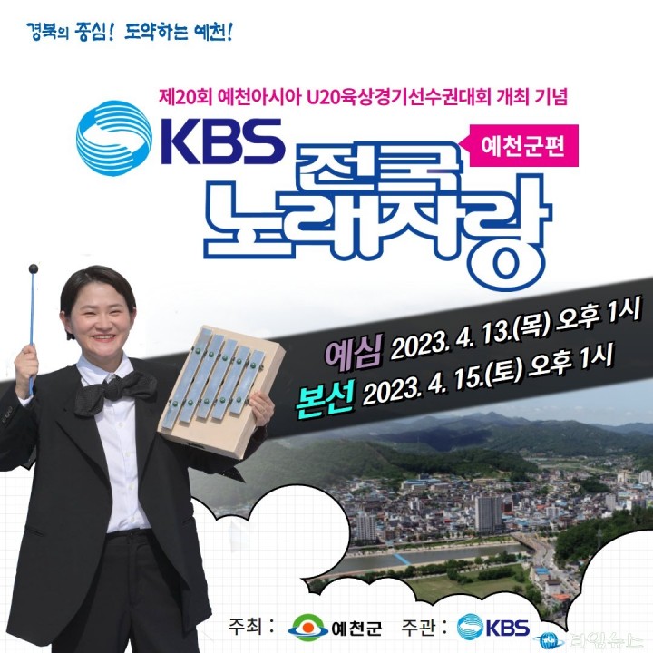 이번 전국노래자랑은 제20회 예천아시아U20육상경기선수권대회 개최를 기념하기 위해 지난 2016년 이후 7년만에 15일 오후 1시 예천읍 한천체육공원 특설무대에서 공개녹화를 진행한다. 7세부터 91세까지 다양한 참가자들이 그동안 숨겨왔던 끼를 마음껏 펼치기 위해 총 248개 팀이 사전 신청을 했으며 사전 신청하지 못한 군민은 예심 당일 현장 신청도 가능하다. 제2의 이찬원이 되고 싶다는 초등학생을 비롯해 친구들과 좋은 추억을 쌓기 위해 참여한 중‧고등학생들, 예천군을 알리고 싶다는 귀농인, 할아버지와 할머니에게 TV에 나오는 모습을 보여주고 싶다는 손녀, 아내의 생일을 축하하기 위해 나온 남편 등 지원자들의 열기로 예심 현장이 후끈 달아오를 것으로 기대된다. 치열하고 공정한 예심을 거쳐 15개 팀이 본선에 진출할 예정이며 본선 녹화는 개그우먼 김신영이 사회를 맡아 진행하고 초대 가수로 조항조, 이혜리, 윙크, 신승태, 은가은 등이 출연해 무대를 빛낸다. 김학동 예천군수는 “이번 KBS 전국노래자랑은 6월 4일부터 7일까지 예천스타디움 일원에서 열리는 제20회 예천아시아U20육상경기선수권대회 성공 개최를 염원하는 뜻깊은 자리인 만큼 군민들을 비롯한 인근 지역 주민들도 함께 참여해 즐겨주시길 바란다."고 말했다.
