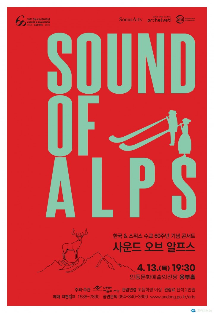 스위스는 푸른 알프스산맥의 초원에 만년설과 아름다운 호수가 있는 경이로운 자연을 지켜온 나라로 정평이 난 곳이다. 이곳 스위스를 대표하는 전통 음악 연주자와 한국의 젊은 클래식 연주자들이 한국과 스위스 수교 60주년을 기념하여 음악으로 화합하는 무대를 선보인다. 알프스 지방에서 가성을 섞어 특이한 소리를 내어 부르는 스위스 민요 요들과 목동들이 사용하는 원뿔형의 긴 관과 컵 모양의 마우스피스로 구성된 스위스 전통악기 알프호른, 전통 아코디언 슈비제르오르겔리를 감상할 좋은 기회이다. 또한, 이번 공연을 위해 특별히 작곡된 창작곡 다니엘 슈나이더의 ‘두 알프호른과 현악 4중주 그리고 성악을 위한 노래’를 2023년 모차르트 국제 콩쿠르 현악사중주 부분 1위 및 최고 해석상을 수상한 한국의 젊은 연주자들로 구성된 아레테 콰르텟과 호른의 연주로 선보인다. 한국에서는 좀처럼 만나보기 힘든 청아한 목소리의 요들과 세상에서 가장 긴 악기로 알려진 알프호른의 전통 연주와 현악사중주가 함께하는 독특한 편성으로 진행된다. 관람객들에게 세계 각국의 아름다운 봄날의 경치를 상상하고 느끼게 할 것으로 기대된다. 안동문화예술의전당 기획공연 ‘사운드 오브 알프스’은 전석 2만 원으로 초등학생 이상 관람이 가능하다. 자세한 사항은 전화(☎054-840-3600)로 문의하거나 안동문화예술의전당 홈페이지(http://www.andong.go.kr/arts)에서 확인할 수 있다.