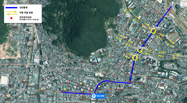 단, 공화동사거리, 동문동성당 입구 오거리, 관문동 골드클래스 입구 등은 직진방향(중앙여고→여수고 방향)에 한해 4일 오후 5시부터 저녁 7시 50분까지 부분 통행이 가능하다.