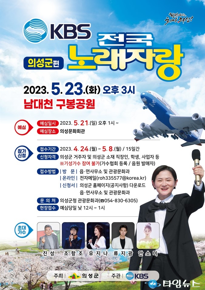 KBS 대표 간판 프로그램인 전국노래자랑이 의성군을 다시 찾은 것은 2018년 이후 5년만으로 MC 김신영과 초대가수 진성, 조항조, 유지나, 류지광, 안소미가 출연해 군민에게 즐거움을 선사할 예정이다. 예심은 5월 21일(일) 오후 1시 의성문화회관에서 진행되며, 1·2차 예심을 통해 15팀 내외로 본선 진출자를 선발할 계획이다. 예심참가는 기성가수를 제외한 군민 누구나 신청 가능하며, 4월 24일 월요일부터 접수를 시작해 5월 8일 월요일까지 읍·면사무소, 관광문화과를 직접 방문 신청 또는 의성군 홈페이지를 공지사항 게시판에서 신청서를 내려받아 이메일(roh335577@korea.kr) 신청도 가능하다. 자세한 사항은 관광문화과 관광마케팅팀(☎054-830-6305)으로 문의하면 된다. 김주수 의성군수는 “2018년 이후 5년 만에 의성에서 열릴 전국노래자랑에 의성의 끼와 재능을 가진 숨은 실력자들의 많은 참여를 바라며 이번 기회를 통해 군민이 다시 활력을 찾고, 군민 소통과 화합의 무대가 되기를 바란다"라고 말했다.