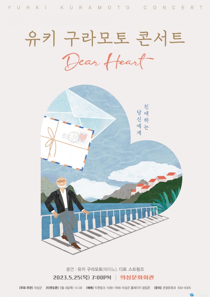 이번 공연은 나에게 다정한 안부를 건네는 ‘Dear Heart’ 타이틀로 피아노 솔로를 비롯해 콰르텟(김지윤(Vn), 이윤하(Vc), 강신일(Cl), 한지은(Fl))과 함께 풍성한 무대를 준비한다. 바쁜 일상 중에 잠시 멈춰, 유키 구라모토의 아름다운 선율에 기대어 마음을 가만히 들어보는 소중한 시간이 될 것이다. 올해 내한 24주년을 맞은 유키 구라모토는 1999년 봄처럼 내한한 이후 매년 한국을 방문하며 공연과 음반으로 사랑받고 있다. 꾸준한 창작으로 그가 녹음했거나 연주한 곡은 360여 곡에 이르며, 특히 “Lake Louise", “Romance", “Meditation" 등의 히트곡으로 널리 사랑받고 있다. 김주수 의성군수는 “지역에서는 접하긴 힘든 피아니스트의 따뜻하고 서정적인 멜로디에 군민들이 회상과 추억에 잠기고 위로를 받는 유익한 시간으로 채워지길 바란다"라고 말했다. 공연예매는 5월 4일(목) 오후 2시부터 티켓링크(1588-7890)와 의성군 홈페이지 팝업존을 통해 가능하며 티켓가격은 R석 5만원, S석 4만원에 판매된다. 단, 의성군민 및 지역 근로자에 한해 특별가 R석 2만원, S석 1만원에 구입 가능하다. (문의:관광문화과 ☎054-830-6305)