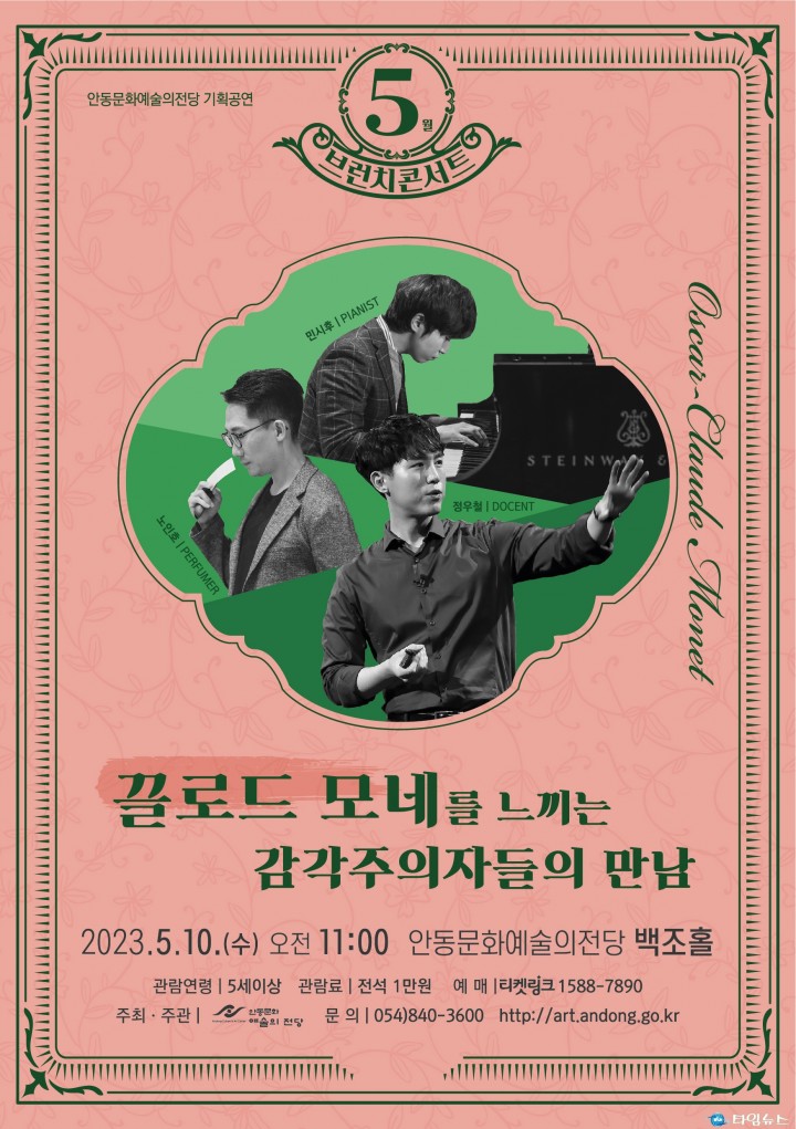 빛에 따라 실시간으로 변화하는 대상의 색과 형태를 포착하여 표현하여 빛과 그림자의 마술사라고 불리는 끌로드 모네의 작품을 정우철 도슨트의 해박한 설명으로 만나볼 수 있다. 특히, 민시후 피아니스트의 연주로 작품에 어울리는 피아노곡을 함께 듣고 노인호 조향사가 추천하는 다양한 향기도 즐길 수 있는 특색있는 콘서트로 진행된다.카미유와의 결혼 생활에 깊은 만족과 행복감으로 창작열에 불타게 되어 그리게 된 ‘파라솔을 든 여인’, 아름다운 연꽃을 다른 시간, 계절의 변화 속에 빛의 효과를 포착하여 표현한 ‘수련’ 연작 등 끌로드 모네의 작품을 전문 도슨트 해설과 아름다운 피아노 선율을 감상하고 작품에 맞는 향기까지 느낄 수 있는 기대되는 공연이다. 안동문화예술의전당 5월 브런치 콘서트‘끌로드 모네를 느끼는 감각주의자들의 만남’은 전석 1만 원이다. 5세 이상 관람이 가능하며, 자세한 사항은 전화(☎054-840-3600)로 문의하거나 안동문화예술의전당 홈페이지(http://www.andong.go.kr/arts)에서 확인할 수 있다.