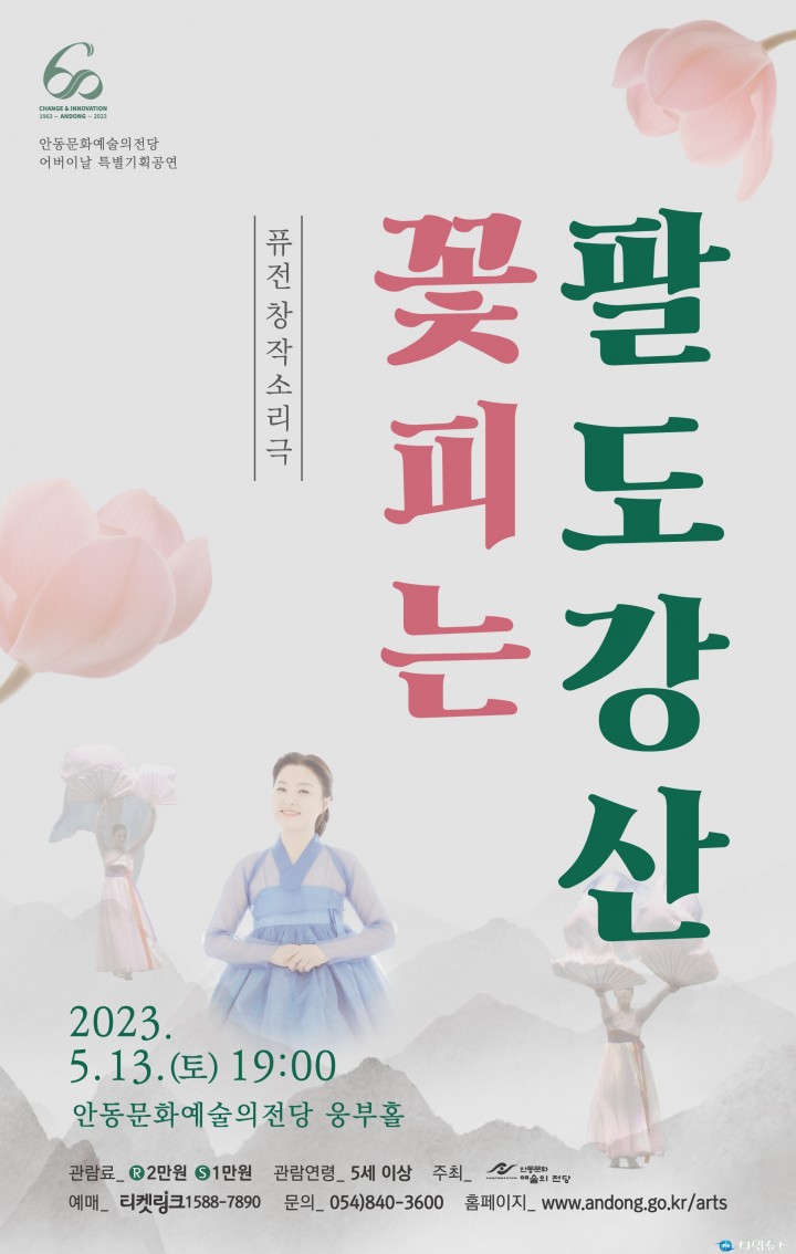 우리나라 팔도강산 만담을 소재로 전통 소리, 국악가요, 흘러간 옛노래에 한국 무용과 국악관현악단이 함께하는 소리극이다. 바다같이 넓은 마음을 가진 바우와 짝사랑하는 여인이 함께 떠나는 아름다운 우리나라 팔도유람기이다. 특히, 이번 공연에는 국악인 오정해가 출연하여 우리의 전통 소리로 기쁨과 화냄, 슬픔과 즐거움의 다양한 희로애락을 음악과 연기로 어르신들의 마음을 사로잡을 것으로 기대한다. 팔도강산에 숨어있는 해학적인 다양한 이야기와 각 지역을 대표하는 소리, 국악 연주, 한국 무용을 결합하여 흥미진진하고 신명 나는 소리극으로 관람객들을 만난다. 안동문화예술의전당 기획공연 퓨전 창작 소리극 ‘꽃피는 팔도강산’ 관람료는 R석 2만 원, S석 1만 원으로 5세 이상 관람이 가능하다. 자세한 사항은 전화(☎054-840-3600)로 문의하거나 안동문화예술의전당 홈페이지(http://www.andong.go.kr/arts)에서 확인할 수 있다.