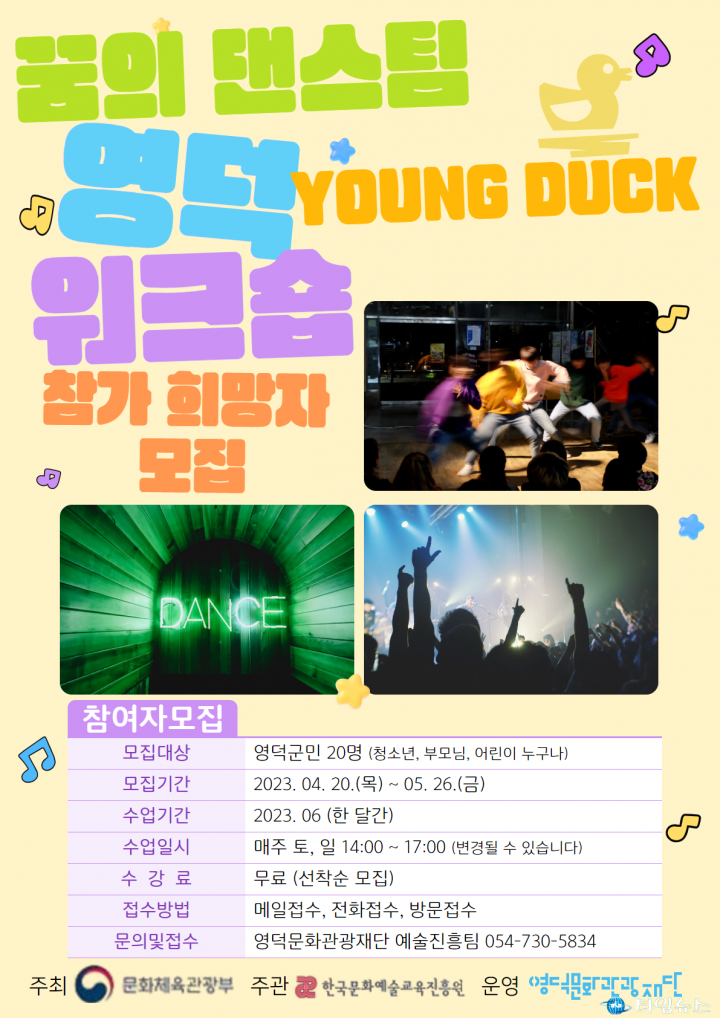 [영덕타임뉴스] 남재선 기자 =(재)영덕문화관광재단은 문화체육관광부 주최, 한국문화예술교육진흥원 주관하는 5년 연속 사업 2023 꿈의 댄스팀 ‘영덕(Young Duck)’프로그램을 오는 6월부터 운영한다. 2023 꿈의 댄스팀‘영덕(Young Duck)’은 지역의 아동, 청소년이 춤을 배우고 추면서 숨겨둔 재능과 정체성을 발견하고 자신만의 세계를 담은 춤을 만들어 가는 경험을 통해 미래 역량을 발굴하고 내적 성장을 이루어내는 무용 교육 프로그램이다. 교육은 K-POP 댄스, 커버댄스, 스트릿 댄스로 시작하여 창작 댄스, 실용 댄스, 컨템포러리로 확장해 나가고 향후 5년 간 지역 대표 청소년 댄스팀을 구성하는 것이 계획이다. 6월부터 시작되는 꿈의 댄스팀‘영덕’워크숍은 영덕군민 대상으로 아동, 청소년, 성인, 가족 단위 등 다양한 세대의 주민들에게‘춤’에 대한 인식을 넓히고 ‘꿈의 댄스팀’의 취지와 의미를 알리며 부모 서포터즈를 소개하는 자리로 마련될 예정이다.