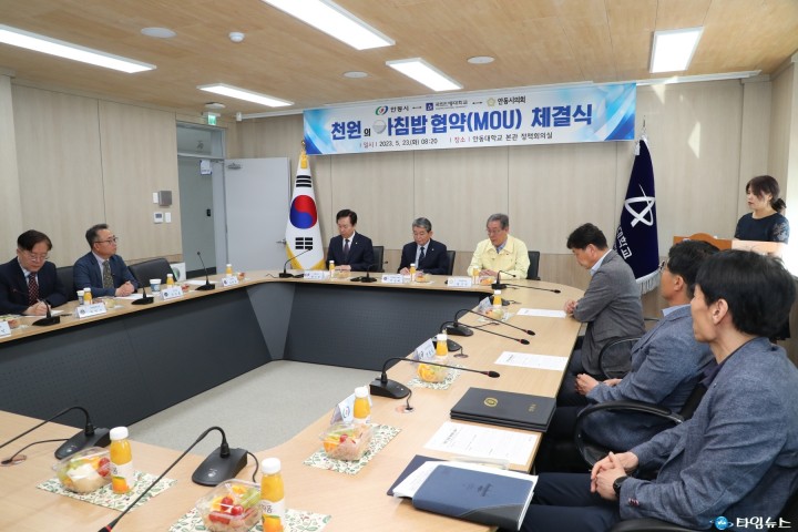 [안동타임뉴스] 남재선 기자 =안동시(시장 권기창)는 23일 안동대학교 정책회의실에서 안동대학교(총장 권순태), 안동시의회(의장 권기익)와 함께 대학생들의 아침을 천원에 제공하는‘천원의 아침밥’ 업무협약(MOU)을 체결했다.