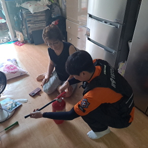 해남 생활안전순찰대는 지난 13일 해남읍에 거주하는 진** 댁에 방문하여 고향사랑기부제 답례품인 '주택화재안전꾸러미(소화기,단독형화재감지기)' 를 설치하였다.