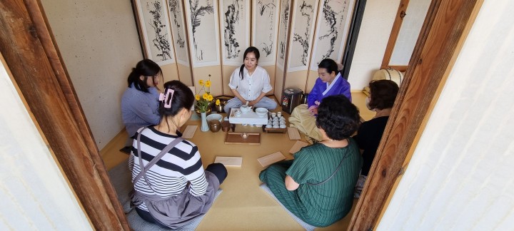 ▲순천시립뿌리깊은나무박물관을 방문한 관람객들이 다도를 체험하고 있다.(사진제공=순천시)