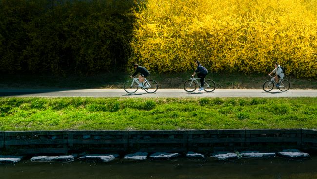 ‘2023 천안의 봄 사진 공모전’ 최우수상은 개나리가 핀 원성천에서 자전거를 타는 사람들을 담은 ‘봄바람 휘날리며’라는 작품 모습[사진=천안시]