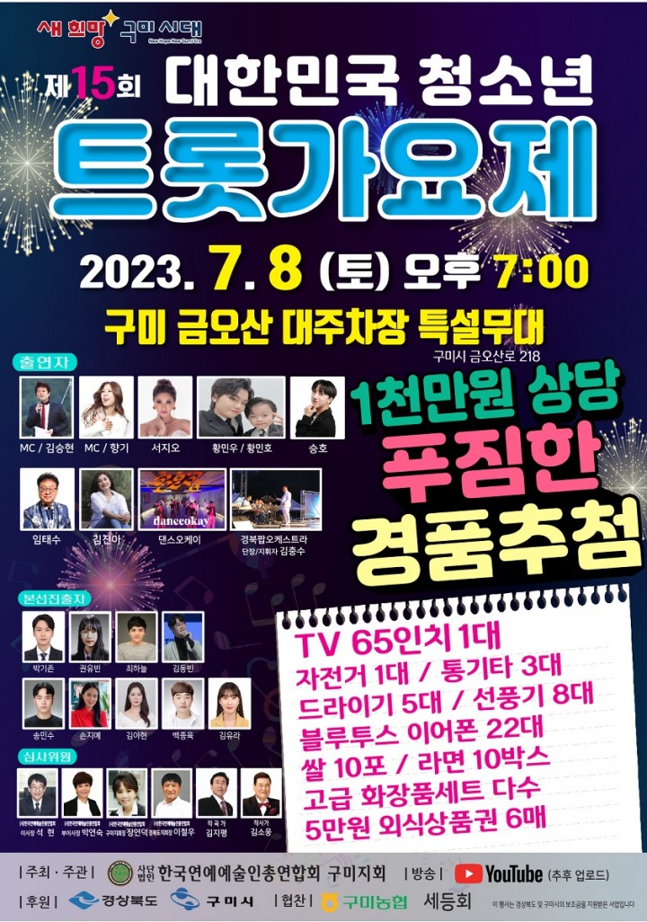 [구미타임뉴스] 김이환 기자 = 구미시는 8일 금오산대주차장에서 (사)한국연예예술인총연합회 구미지회(대표 장연덕) 주관으로「제15회 대한민국청소년트롯가요제」를 개최한다.