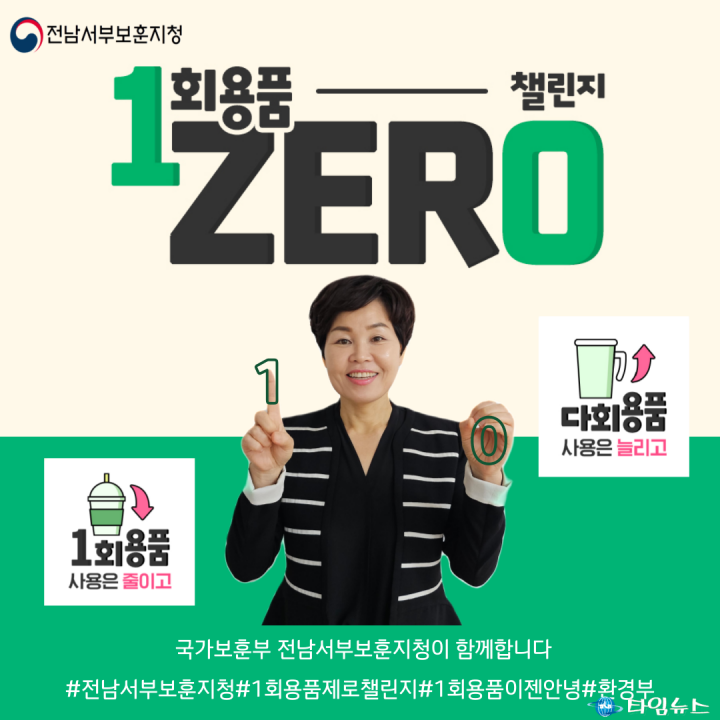 전남서부보훈지청은‘1회용품 ZERO 챌린지’라는 문구와 이미지가 담긴 캠페인 인증 사진을 인스타그램 등 사회관계망서비스(SNS)에 게재해 일회용품 사용을 줄이고 다회용기 사용을 늘리는 것에 앞장설 것을 약속했다.