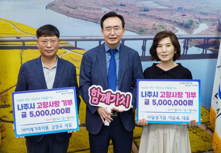 ▲나주시는 ㈜일성기업 이순옥 대표, ㈜이레가축약품 김영국 대표가 각각 고향사랑기부금 500만원을 기탁했다.(사진제공=나주시)