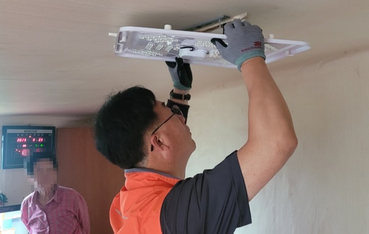 ▲한전MCS(주)가 관내 취약계층 대상으로 주거 안전과 여건 개선을 위해 LED전등 및 리모컨 설치를 하고 있다.(사진제공=나주시)