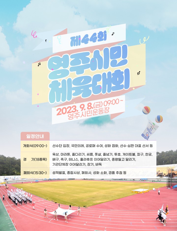 [영주타임뉴스] 김희열기자 = 영주시(시장 박남서)는 오는 8일 영주시민운동장에서 시민 화합 한마당 ‘제44회 영주시민체육대회’를 개최한다.