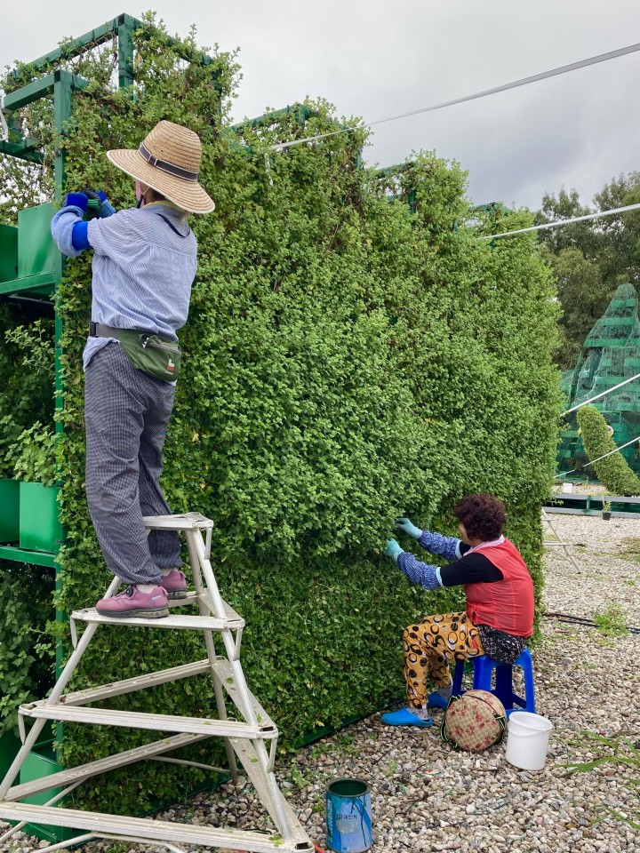 함평군 농업기술센터가 성공적인 축제를 위해 함평 엑스포공원에 설치 될 조형물에 수작업으로 국회 줄기를 고정시키고 있다.