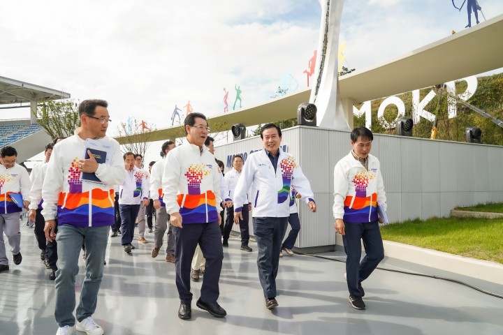 [목포타임뉴스] 김민수기자 = 전국체육대회를 4일 앞둔 9일 주 개최지인 목포시와 전라남도가 공동으로 전국체육대회 개회식 준비가 한창인 목포종합경기장 현장을 찾아 준비상황을 점검했다.이날 현장 점검에는 김영록 전라남도지사를 비롯한 관련 도 실국장단이 참석했고, 목포시에서도 박홍률 목포시장과 부시장을 비롯한 관련 국․과장들이 함께 참여했다.이날 현장 점검은 목포종합경기장 시설 전반에 대한 점검 뿐만 아니라 교통상황실, 안전관리상황실, 수송상황실 등 각 분야별 상황실 운영을 실전과 동일하게 진행하고 현장에서 개선 방안을 모색하는 방식으로 그 어느 때보다 진지하게 현장 점검이 진행됐다.지난 달 6일 준공식을 개최한 바 있는 목포종합경기장은 천연잔디 구장과 9레인의 육상트랙이 갖춰져 있는 공인 1종 육상경기장으로, 대회의 백미라고 할 수 있는 전국체전 개회식이 오는 13일 개최된다.박홍률 목포시장은 “개항 이래 최초로 목포를 주 개최지로 하여 개최되는 양대 체전의 성공 개최를 위해 동참해주시는 시민 여러분들께 깊은 감사를 드린다"며 “대회가 끝나는 순간까지 최선을 다해 준비해서 반드시 성공 체전을 만들겠다."고 말했다.한편, 제104회 전국체전은 오는 10월 13일부터 19일까지 목포를 중심으로 전남 도내 22개 시․군, 70개 경기장에서 49개 종목이 분산 개최되며, 제43회 전국장애인체전은 11월 3일부터 8일까지 12개 시․군, 38개 경기장에서 31개 종목 경기가 펼쳐지게 된다.