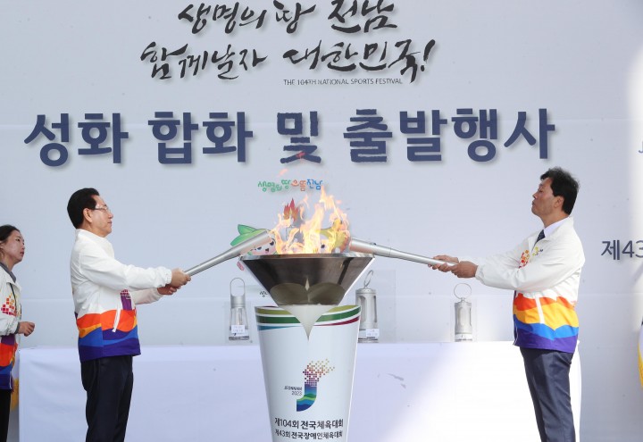 [전남타임뉴스] 오현미 기자 = 김영록 전남도지사가 10일 오전 전남도청 만남의 광장에서 열린 제104회 전국체전과 제43회 전국장애인체전을 밝힐 성화 합화 및 출발행사에서 성화 합화를 하고 있다.