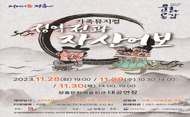 [장흥타임뉴스] 오현미 기자 = 전남 장흥군은 2023년 문예회관과 함께하는 방방곡곡 문화공감 공모사업 공연기획 프로그램 ‘가족뮤지컬 정약전과 자산어보’ 공연을 오는 28일부터 30일까지 5회에 걸쳐 장흥문화예술회관 대공연장에서 개최한다.이번 공연기획 프로그램은 장흥문화예술회관과 전문예술단체 극단 ‘극예술창작집단 흥’과 협업을 통해 만들어낸 공연예술작품으로 한국문화예술회관연합회 공모사업으로 선정돼 총 사업비 5000만원 중 3200만원을 지원받아 제작됐다.‘가족뮤지컬 정약전과 자산어보’는 동화작가 김해등 선생님의 원작을 가족이 함께 즐길 수 있도록 극작가이자 연출가인 안치선(극단 ‘흥’ 대표) 씨가 유초등생 눈높이에 맞추어 각색하고 연출한 뮤지컬 작품으로 러닝타임으로 60분으로 제작됐다.관람료는 전석 무료이며, 입장권은 지난 14일부터 티켓링크를 통해 인터넷 예매하고 있으며 장흥문화예술회관 안내데스크 현장에서 예매할 수 있다.김성 장흥군수는 “수준 높은 공연을 적극 기획하여 군민들의 문화향유 기회 확대를 위해 지속적으로 노력하겠다"고 말했다.