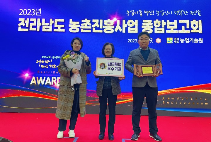 ▲장흥군농업기술센터는 지난 19일 전남도 농업기술원에서 개최한 2023년 농촌진흥사업 종합평가회에서 우수기관으로 선정돼 전남도지사 표창을 받았다.(사진제공=장흥군)