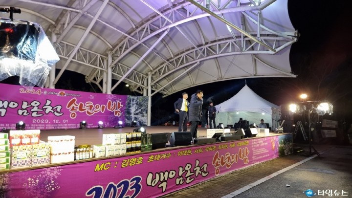 【울진타임뉴스=최경락기자】울진군(군수 손병복)은 지난 12월 31일 온정면청년회(회장 정원수) 주최, 주관으로 진행된 『2023 백암온천 송년의 밤』 행사가 성황리에 마무리 되었다고 전했다. 천연온천 백암관광특구에서 진행된 이번 행사에는 관광객 1,000여 명이 참가하였으며 힘든 경제 여건 속에서도 지역 상가 내수경기 활성화와 온정면민의 화합을 다지는 계기가 되었다. 이번 행사는 미스터트롯3에 출연한 인기가수 이대원과 관광객이 함께 어우러진 공연을 비롯해 다양한 경품 추첨 등 풍성한 프로그램으로 진행되었다. 특히 백암온천을 찾은 관광객들에게 울진 붉은대게를 무료로 나누어 주는 이벤트 등을 통해 큰 호응을 얻었다. 최윤홍 온정면장은 “『2023 백암온천 송년의 밤』 행사를 위해 노력해 준 온정면청년회에 감사드리며, 갑진년 새해에는 백암온천의 위기를 극복하고 천년을 이어온 백암온천이 다시 활기를 찾을 수 있도록 온정면민들의 지혜를 모아달라고 당부드린다"고 전했다. 손병복 울진군수는 환영사에서 “대한민국의 숨, 울진" 백암온천을 방문하여 주신 관광객들을 환영한다"며 “지역주민과 관광객 모두에게 희망찬 새해가 되기를 바라며, 최고의 수질을 자랑하는 백암온천특구에 앞으로도 많이 찾아와 주시기를 바란다"고 전했다.