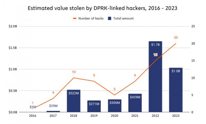 이는 2022년의 15곳을 뛰어넘는 것으로, 북한의 가상화폐 해킹 데이터가 수집된 2016년 이후 가장 많은 것으로 집계됐다. 이들 해킹 조직이 20곳의 거래소에서 빼낸 가상화폐는 약 10억 달러에 달한다고 보고서는 분석했다. 17억 달러에 달했던 2022년보다 금액면에서는 적은 수준이다.북한 연계 해킹조직은 2021년에는 9곳에서 4억2천900만 달러 상당의 가상화폐를 빼내 갔다.체이널리시스는 "김수키와 라자루스 그룹 등 해커 조직이 대량의 가상자산을 획득하기 위해 다양한 악성 전술을 구사하는 등 최근 수년간 북한 관련 해킹이 증가하고 있다"고 밝혔다.미국 연방수사국(FBI)은 지난해 9월 라자루스 그룹이 온라인 카지노 및 베팅 플랫폼 스테이크 닷컴(Stake.com)에서 4천100만 달러 규모의 가상화폐 자산을 훔쳤다고 밝힌 바 있다. 또 지난해 11월 미 재무부 산하 해외자산통제국(OFAC)은 가상화폐 업체 신바드를 제재했다. 신바드는 라자루스 그룹이 탈취한 가상화폐의 세탁에 관여한 이른바 '믹서'를 사용하는 업체다.믹서는 가상화폐를 쪼개 누가 전송했는지 알 수 없도록 만드는 기술로, 이 과정을 반복하면 자금 사용처와 현금화 여부 등 추적이 어려워진다.