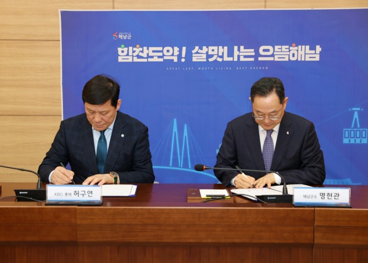 [해남타임뉴스] 김민수 기자 = 해남군과 한국야구위원회는 21일 남해안벨트 야구클러스터 구축 사업의 일환으로 상호협력을 위한 업무협약(MOU)을 체결했다.이날 해남군청 상황실에서는 명현관 해남군수와 허구연 KBO 총재가 참석한 가운데 전라남도에서는 처음으로 해남군이 업무협약을 체결했다. 협약에 따라 양 기관은 야구장 인프라 조성에 대한 컨설팅과 공동활용, 전지훈련 장소 제공 및 운영, 해남군 홍보 등 상호지원을 통해 야구발전과 지역경제 활성화에 상생협력해 나가기로 했다.