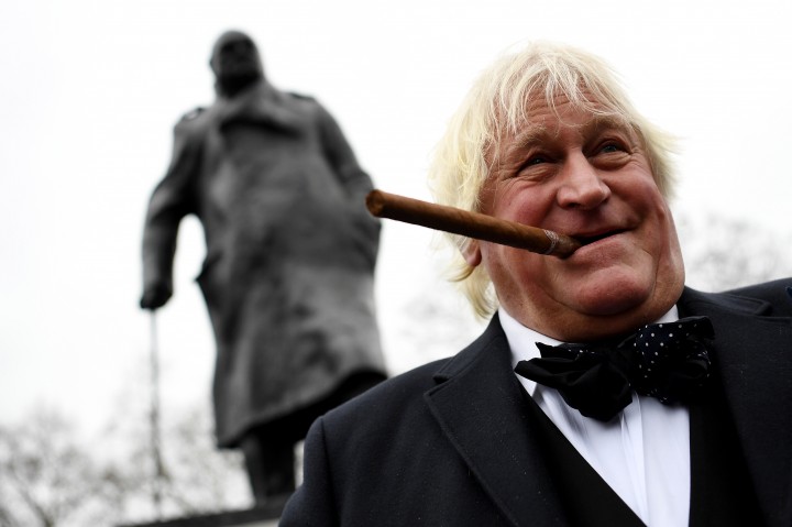 [런던 의사당 처칠 동상 앞에서 시가 피는 남성]