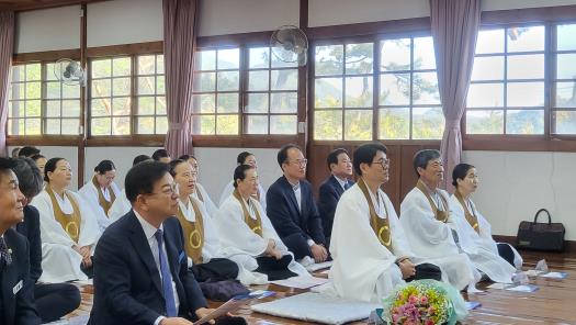 이날 영광교구와 영산성지공동체 주관으로 영산성지 대각전에서 영광교구 김선명 교구장, 영산사무소 김경일 소장, 영산선학대학교 백인혁 총장, 국제마음훈련원 이경열 원장, 김정운 교의회의장, 더불어민주당 이개호 국회의원과 강종만 영광군수, 강필구 영광군의회 의장과 도의원, 군의원, 교구 교무님과 기관장 등이 참석했다.