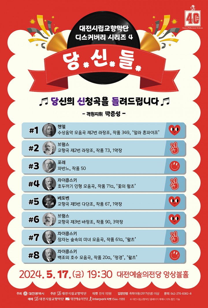 [대전타임뉴스=홍대인 기자] 누구나 자신의 마음속에 좋아하는 곡 하나쯤은 담아두고 있을 것이다. 그런 곡을 하나하나 모아서 대전시립교향악단이 특별한 연주회를 준비했다.5월 17일(금), 오후 7시 30분 대전예술의전당 앙상블홀에서 하는 ‘디스커버리 시리즈 4 당.신.들(당신의 신청곡을 들려드립니다)’이 그것이다.대전시향은 지난해 12월, 2번의 오프라인 연주회와 소셜네트워크에서 관객들을 대상으로 신청곡을 조사하고, 202명의 관객이 참여했다.총 134곡의 신청곡 중 8곡을 선정해 구성한 이번 공연은 자신의 신청곡은 물론 다른 사람의 신청곡도 들으며 취향을 공유할 수 있는 색다른 연주회가 될 예정이다.2020년에 아르투루 니키쉬 국제 지휘 콩쿠르에서 우승하며 화제가 된 박준성의 지휘로 함께하는 이번 공연은 헨델, 브람스, 포레, 차이콥스키, 베토벤까지 한국인이 사랑하는 작곡가들의 가장 친숙한 음악을 가득 담았다.연주회는 헨델의 ‘수상음악 모음곡 제2번 중 알라 혼파이프’로 경쾌하게 시작하여 브람스의 ‘교향곡 제2번, 1악장’, 포레의 ‘파반느’까지 봄에 어울리는 평화로운 곡을 선보이고, 차이콥스키의 ‘호두까기 인형 모음곡 중 꽃의 왈츠’를 마지막으로 화려하게 1부를 마무리한다.2부에서는 베토벤의 ‘교향곡 제5번 중 1악장’과 브람스의 ‘교향곡 제3번, 3악장’으로 무게감 있게 시작하여, 차이콥스키의 발레 모음곡 ‘잠자는 숲속의 미녀’와 ‘백조의 호수 모음곡’의 우아하고 경쾌한 곡을 연이어 들려주며 대미를 장식한다.대전시향 관계자는 “이번 연주회에서 관객은 단순히 음악을 듣는 청자가 아니라, 직접 콘서트를 기획하고 함께 만들어가는 대전시향의 동반자로서 함께한다. 이번 연주에 많은 관심과 참여를 바란다"고 밝혔다. 예매는 공연 전일 오후 5시까지 대전시립교향악단 홈페이지, 대전예술의전당 홈페이지, 인터파크(1544-1555) 등에서 가능하며, 취학연령(2017년생) 이상 관람할 수 있다.자세한 사항은 대전시립교향악단 홈페이지를 참조하거나 전화(042-270-8382~8)로 문의하면 된다.