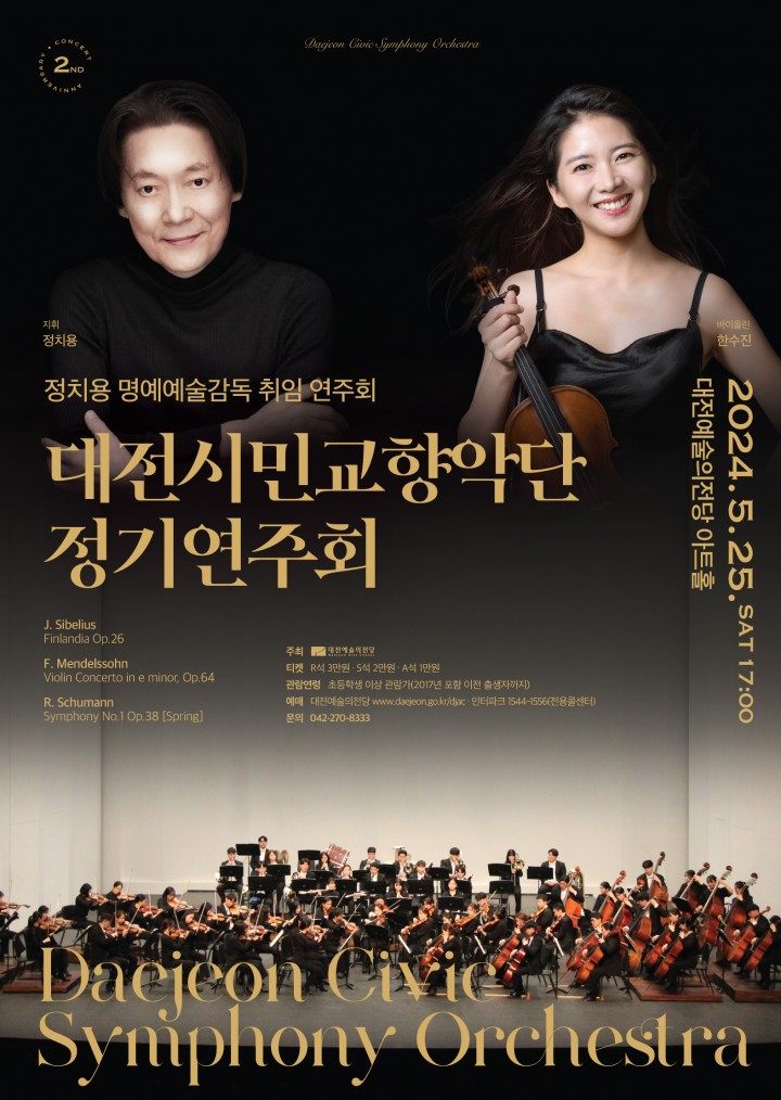 [대전타임뉴스=홍대인 기자] 대전예술의전당(관장 김덕규)은 대전시민교향악단의 2024년 첫 정기연주회가 오는 25일, 오후 5시 아트홀에서 개최된다.지난 4월, 새로운 명예 예술감독 겸 상임지휘자로 취임된 대한민국 최정상 지휘자 정치용과 올 초 단원이 증원돼 80인으로 구성된 대전시민교향악단(Daejeon Civic Symphony Orchestra)이 호흡을 맞추는 첫 무대이다.특히 하늘이 내린 재능의 소유자, 바이올리니스트 한수진과 협연해 섬세하면서도 웅장한 무대를 만나 볼 수 있다.이번 무대는‘봄’이라는 키워드로, 청년으로 구성된 대전시민교향악단과 각 작곡가들이 열정 가득한 30대에 작곡한 곡 「시벨리우스, 핀란디아」, 「멘델스존, 바이올린 협주곡」, 「슈만, 교향곡 1번 봄」으로 구성해 그 의미를 더했다.그들의 낭만과 열정을 만날 수 있는, 청년들의 가장 아름다운 시기인 인생의 봄의 무대가 펼쳐진다.지휘자 정치용은 한국지휘자협회 회장을 역임, 서울시립교향악단, 코리안심포니오케스트라, 국립심포니오케스트라, 원주시립교향악단 예술감독 겸 상임지휘자 등으로 활동했으며 현재는 한국예술종합학교 명예교수로 재직 중이며 후학 양성에 기여하고 있다.협연자 한수진은 세계적 권위의 비에니아프스키 국제콩쿠르에서 최초의 한국인으로 콩쿠르 역사상 최연소 수상자로서 2등 입상과 함께 음악평론가상 등을 수상, 런던 심포니, 포즈난 필하모닉, 서울시향 등 유수의 오케스트라들과 협연하며 다양한 활동을 이어가고 있다.고품격 음악의 깊이를 그려낼 이번 공연의 티켓은 R석 3만원, S석 2만원, A석 1만원이며 초등학생 이상(2017년 포함, 이전 출생자)이면 관람 가능하다.자세한 내용은 대전예술의전당 홈페이지(www.daejeon.go.kr/djac)를 참조하면 된다.